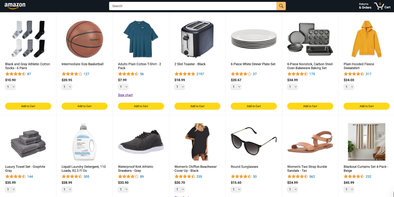 A fully functional multi-page Amazon clone website featuring product browsing, cart management, checkout, order history, and delivery tracking pages. Built as part of the 22-hour JavaScript course by SuperSimpleDev using provided HTML and CSS templates.